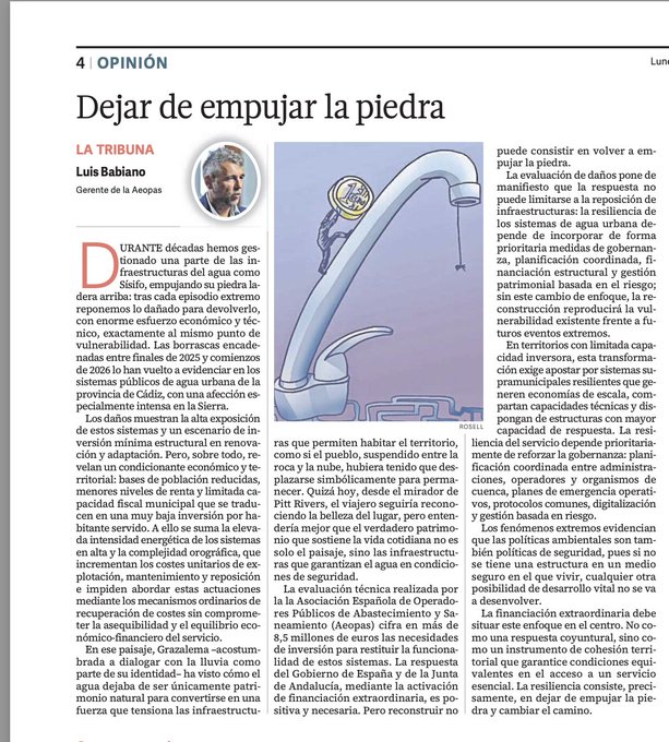 Una evaluación técnica realizada por la Asociación Española de Operadores Públicos de Abastecimiento y Saneamiento (Aeopas) estima en más de 8,5 millones de euros la inversión necesaria para recuperar la funcionalidad de estos sistemas. La respuesta del Gobierno de España y de la Junta de Andalucía, activando financiación extraordinaria, es positiva y necesaria. Pero reconstruir no puede consistir simplemente en volver a empujar la piedra.
